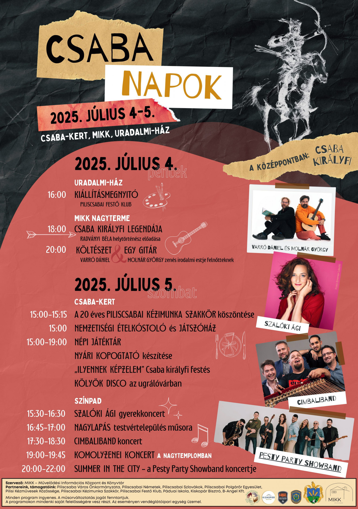 Július 4-én, pénteken megnyílik a helyi amatőr festők kiállítása az Uradalmi házban, este pedig elmerülhetünk városunk névadójának, Csaba királyfinak a legendájában Radványi Béla helytörténésszel, majd Varró Dániel és Molnár György zenés irodalmi estjével zárjuk a napot.