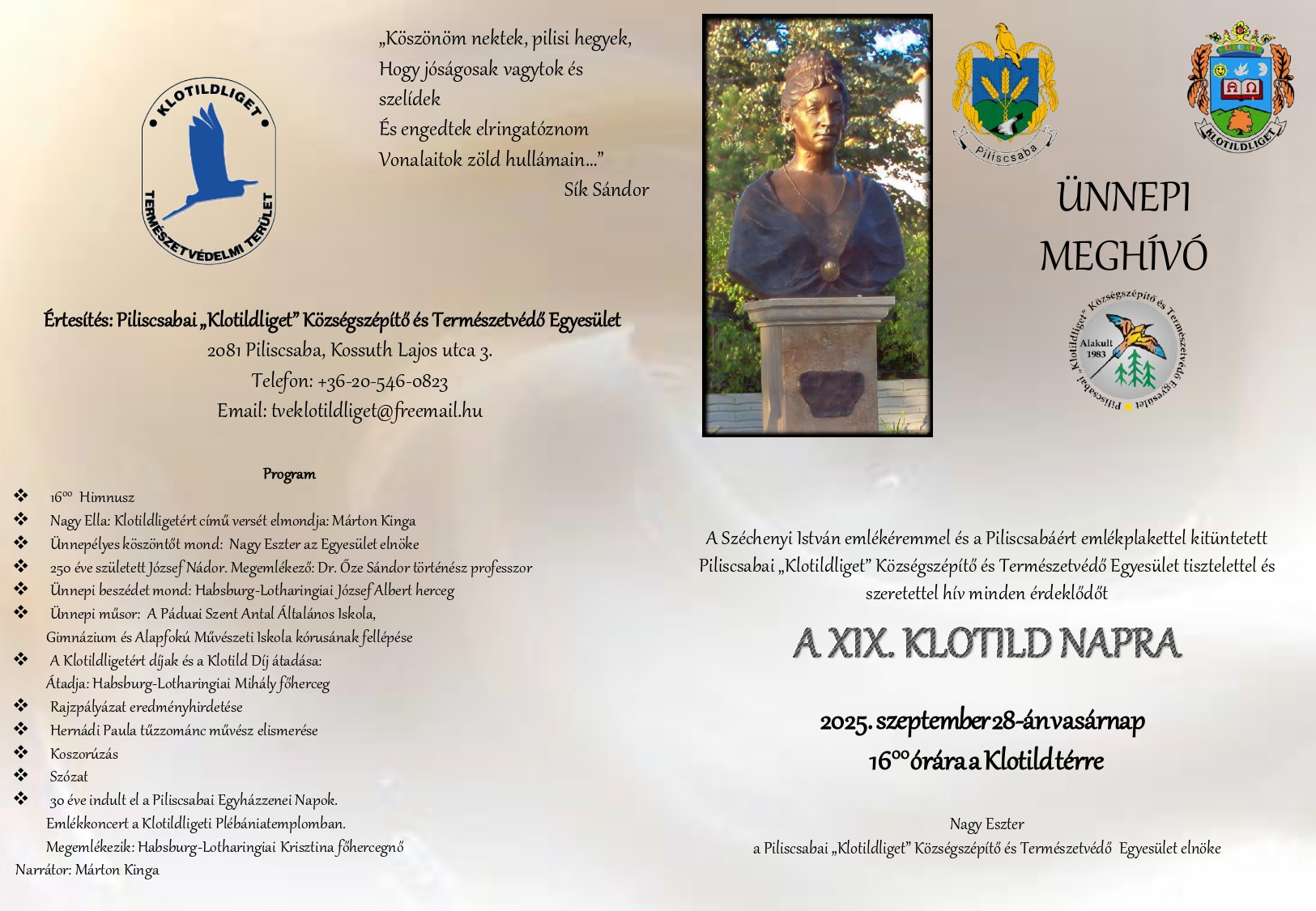 A Piliscsabai „Klotildliget” Községszépítő és Természetvédő Egyesület tisztelettel és szeretettel hív minden érdeklődőt A XIX. KLOTILD-NAPRA 2025. szeptember 28-án vasárnap 16.00 órára a Klotild térre.